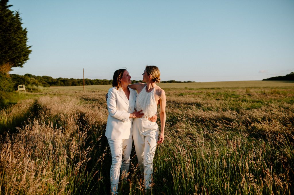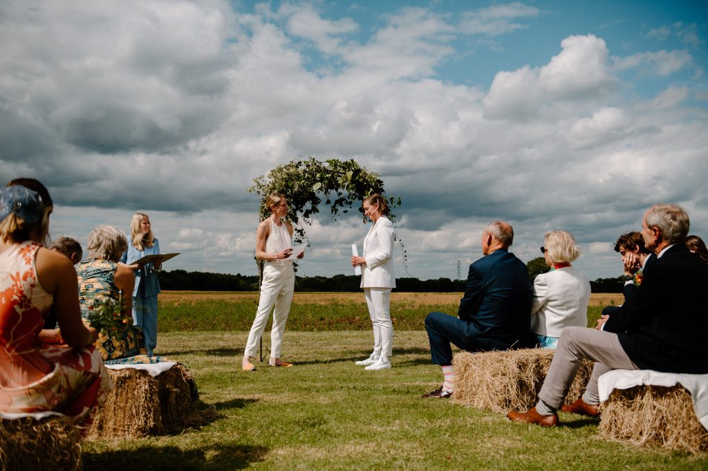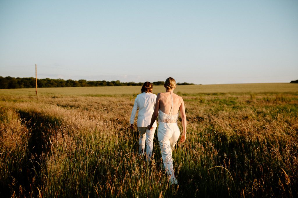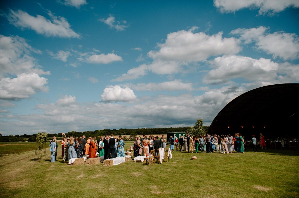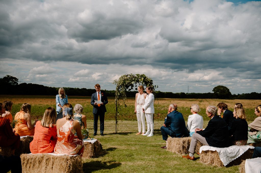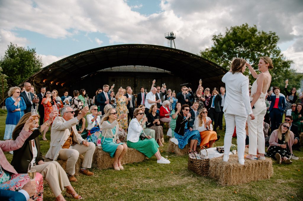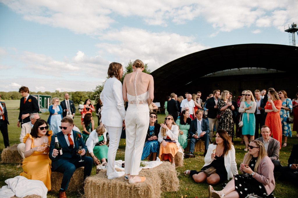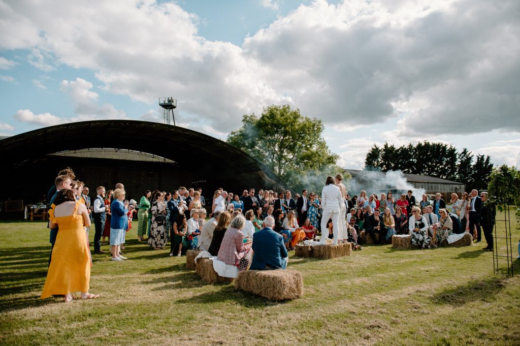 This outdoor barn wedding (which is also hosted in the old hangar on the venue) was simply the best from start to finish. The couple got ready in the Shepard’s huts in the site with their wedding parties. It was a really relaxed and beautiful morning. Followed by the loveliest first look sessions that I have ever had the pleasure of witnessing. Both Jess and Katie were so loved up and into what each other had chosen for their wedding outfits. The couple walked down the aisle together, with a gorgeously celebrant led outdoor wedding ceremony. The speeches were given outdoors with guests sitting upon hay bales, and dinner was served inside the hangar as the sun was beginning to set. More speeches were given as pudding arrived and then after dinner we snuck into the fields with golden hour light for a few more couples portraits.