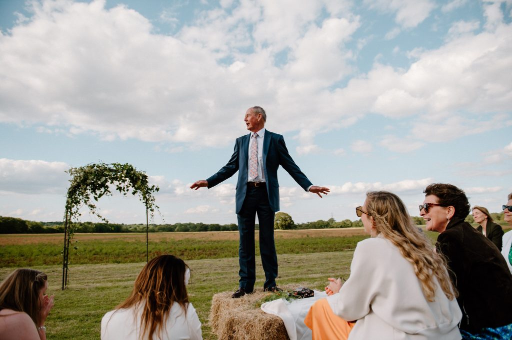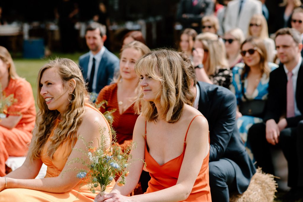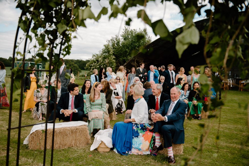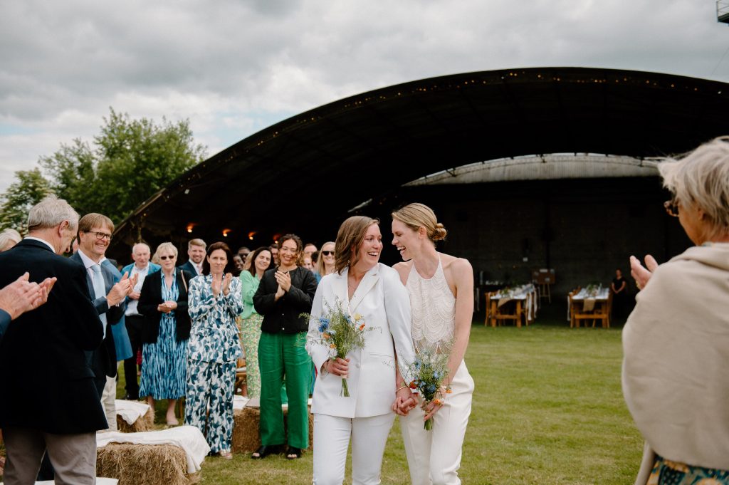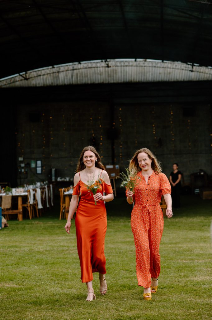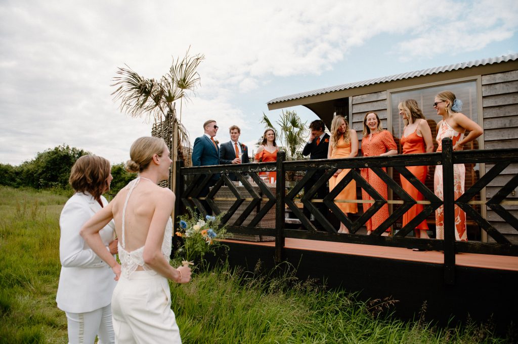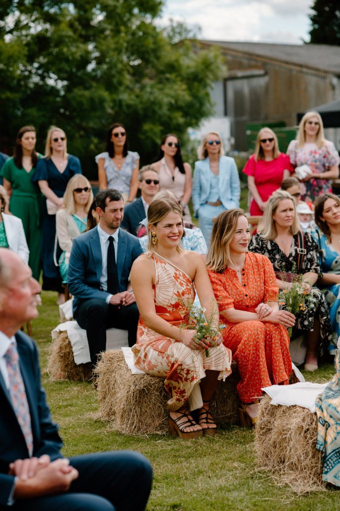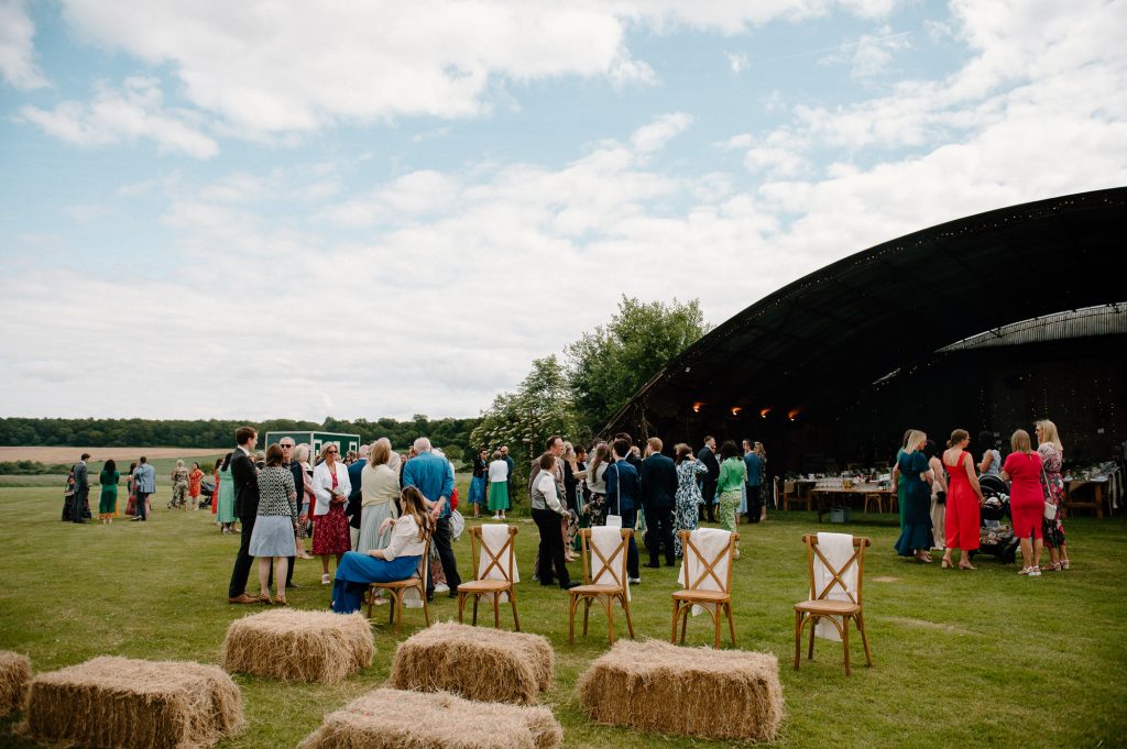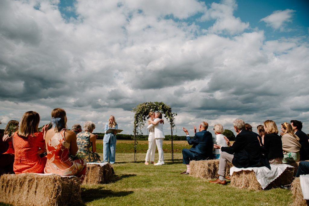 This outdoor barn wedding (which is also hosted in the old hangar on the venue) was simply the best from start to finish. The couple got ready in the Shepard’s huts in the site with their wedding parties. It was a really relaxed and beautiful morning. Followed by the loveliest first look sessions that I have ever had the pleasure of witnessing. Both Jess and Katie were so loved up and into what each other had chosen for their wedding outfits. The couple walked down the aisle together, with a gorgeously celebrant led outdoor wedding ceremony. The speeches were given outdoors with guests sitting upon hay bales, and dinner was served inside the hangar as the sun was beginning to set. More speeches were given as pudding arrived and then after dinner we snuck into the fields with golden hour light for a few more couples portraits.
