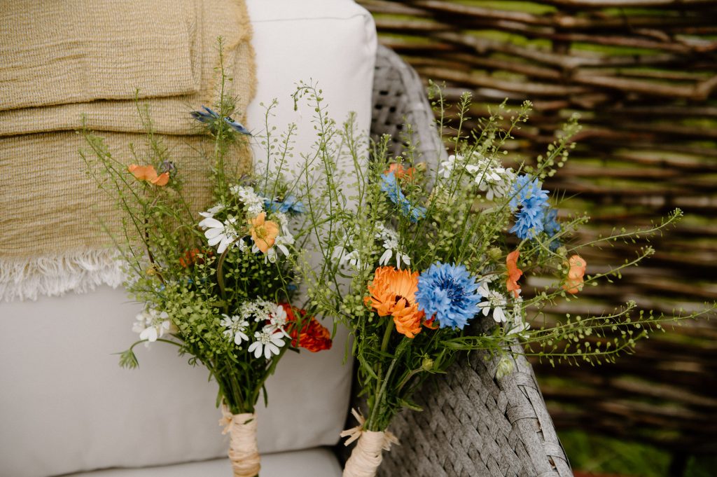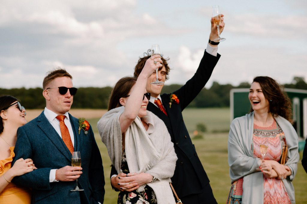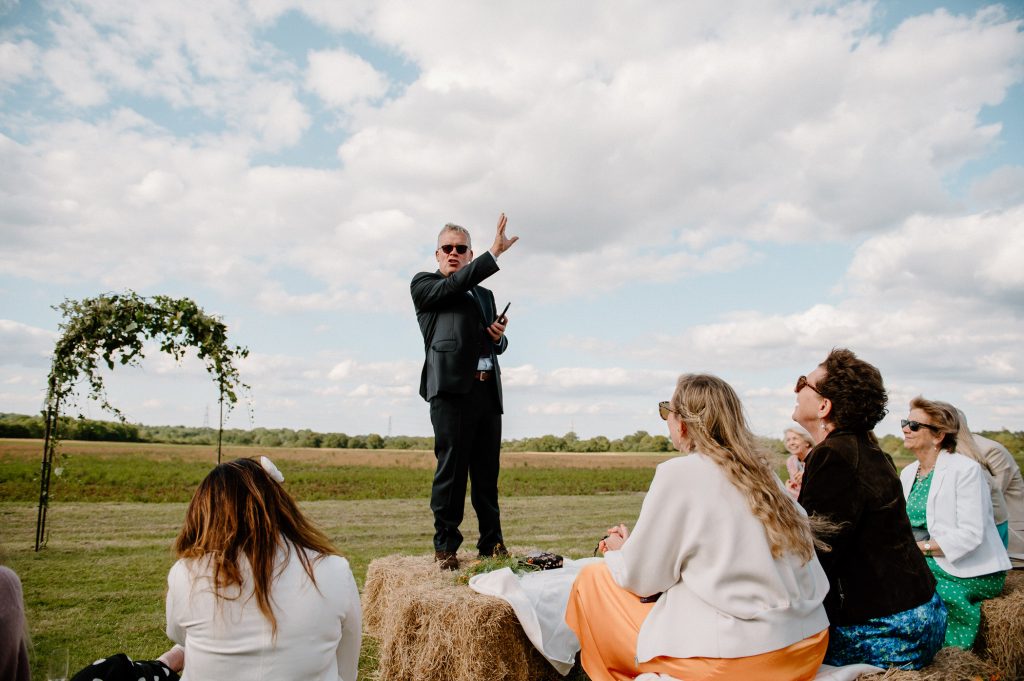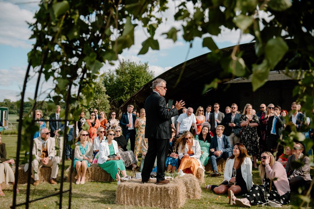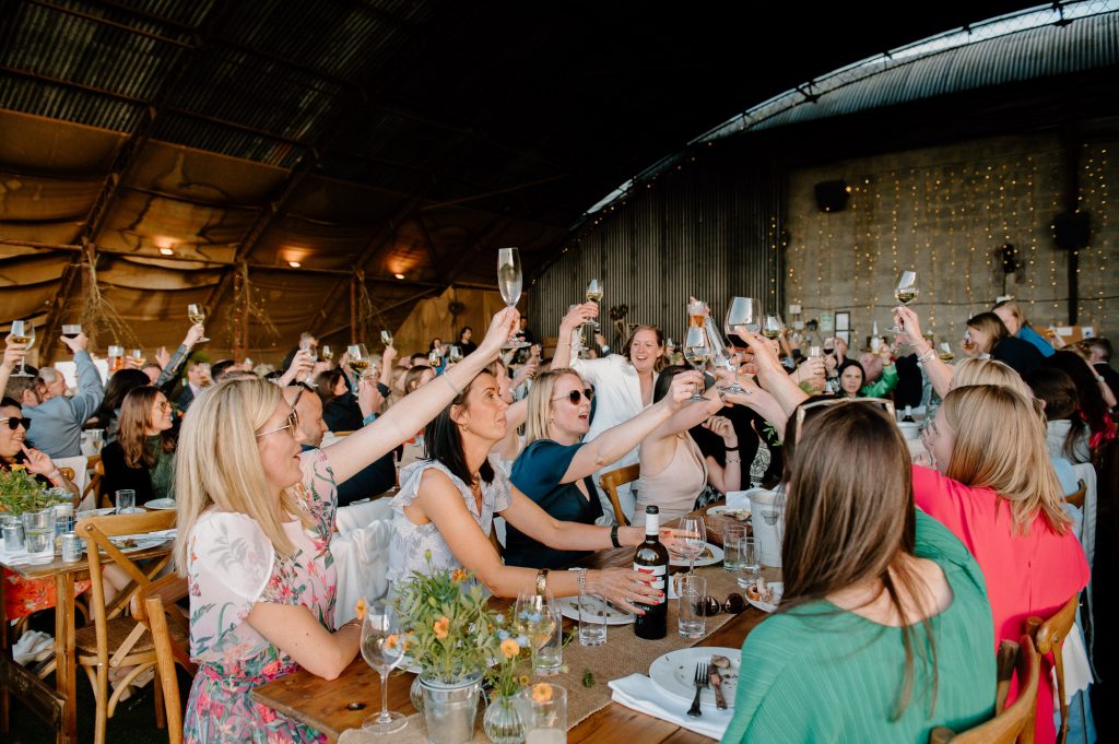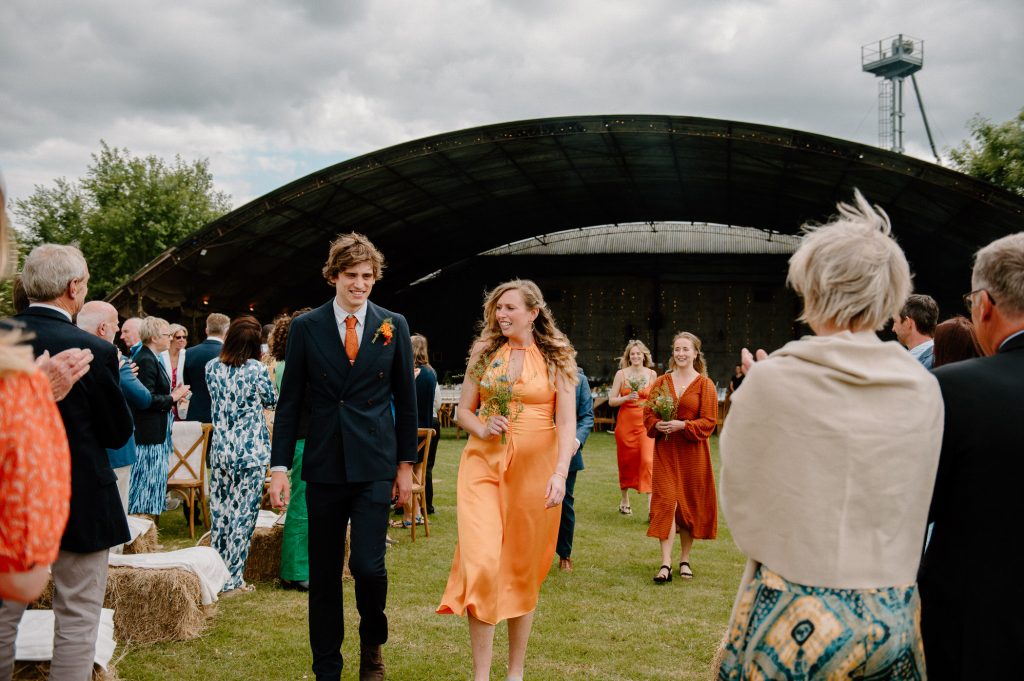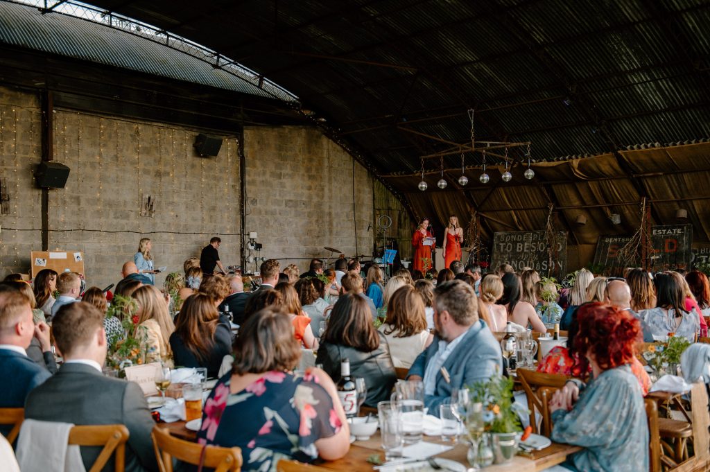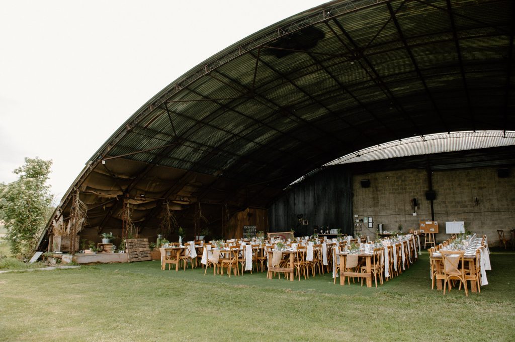 This outdoor barn wedding (which is also hosted in the old hangar on the venue) was simply the best from start to finish. The couple got ready in the Shepard’s huts in the site with their wedding parties. It was a really relaxed and beautiful morning. Followed by the loveliest first look sessions that I have ever had the pleasure of witnessing. Both Jess and Katie were so loved up and into what each other had chosen for their wedding outfits. The couple walked down the aisle together, with a gorgeously celebrant led outdoor wedding ceremony. The speeches were given outdoors with guests sitting upon hay bales, and dinner was served inside the hangar as the sun was beginning to set. More speeches were given as pudding arrived and then after dinner we snuck into the fields with golden hour light for a few more couples portraits.